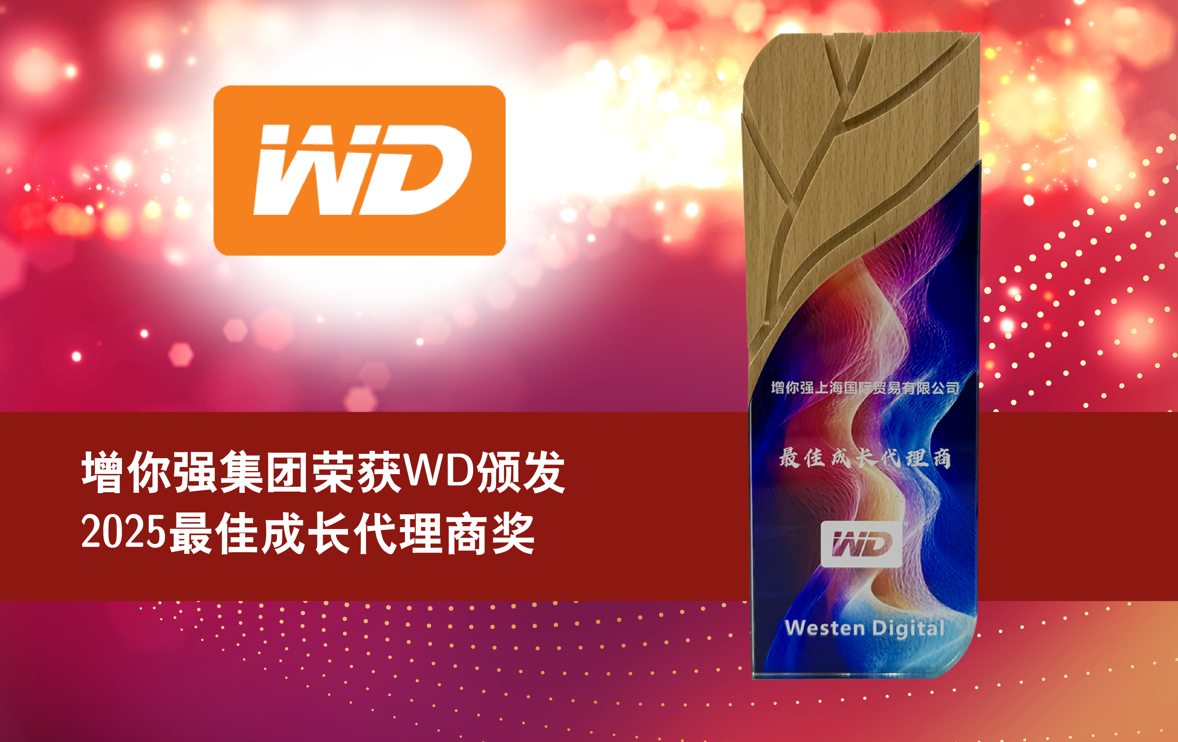 增你强荣获西部数据(Western Digital Corporation; WD)颁发的【最佳成长代理商】殊荣,此项奖项充分印证增你强集团在大中华区市场的长期合作价值与稳健表现。
